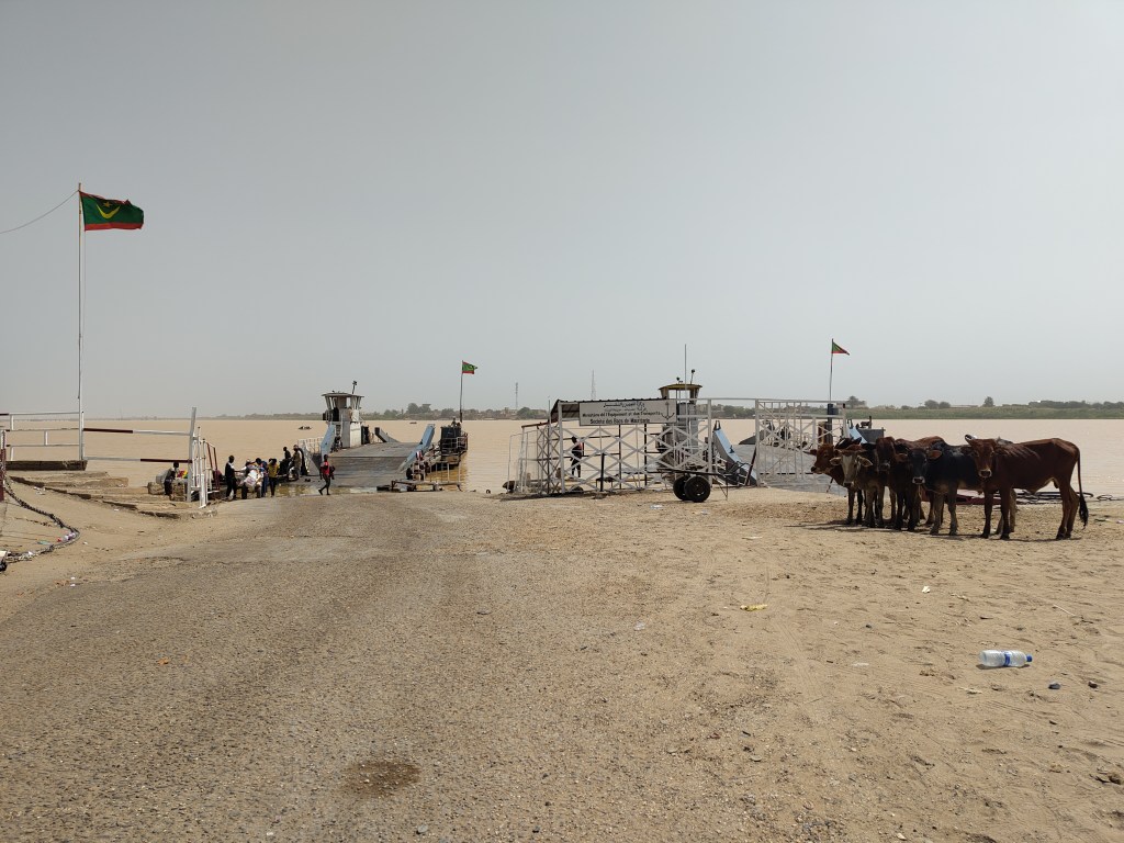 Pour rejoindre Rosso, ce sera 300 ouguiyas (6,5€), 200 kilomètres et trois heures de route. La petite ville-frontière nous accueille dans un désordre prévisible, où les rabatteurs se jettent sur les voyageurs pour changer leur monnaie, leur vendre des cartes SIM, ou simplement pour leur indiquer le poste frontière… Atteindre le pays voisin nécessite de franchir le fleuve Sénégal. Tout près, un immense pont est en construction. Une entreprise chinoise (Poly Changda) s’active pour relier par la route les deux pays. En attendant, un bac relie les deux rives chaque heure, et des pirogues proposent leurs services pour qui veut éviter d’attendre le départ aléatoire du bac surchargé.