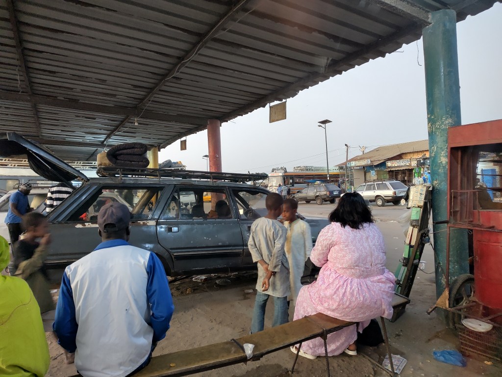 Je rejoins Dakar le lendemain, en misant sur le seul car quotidien partant à 7h pour éviter l’interminable trajet en taxi brousse. Pas de chance : j’apprends sur place qu’il aurait fallu réserver et que le trajet du jour est déjà plein. Le car file sous mes yeux, et j’attends près de deux heures qu’un « 7 places » se remplisse.
